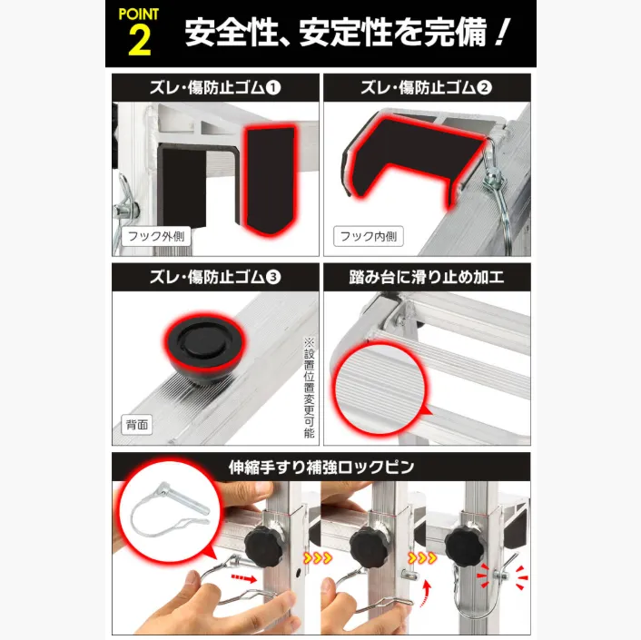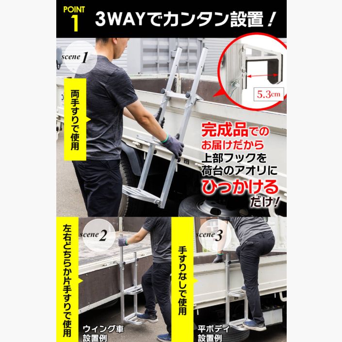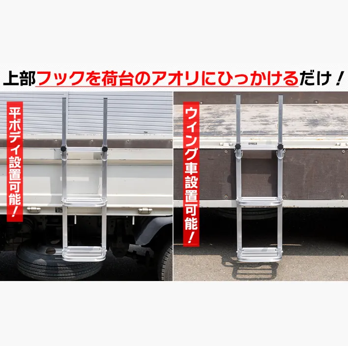 【滑り止め、ズレ・傷防止】ステップの表面に加工されている溝が滑りを軽減します。本体裏面には滑り止めゴムボルトが取り付けてあり、2段階で調整可能です。また、フックの内側にスポンジマットが付いていますので使用中のズレやあおりへの傷を防ぎます。また。フック外側にもスポンジマットが付いておりますのでウィング車等あおりを下した状態での設置でも車体への傷を防ぎます。 確認事項 送料込みのお値段ですが北海道、沖縄、離島は別途送料がかかります。その場合は価格を変更いたしますのでご購入前にコメントでお知らせください。 上記以外へ発送の場合は即購入OKです。 お値下げのコメントはご遠慮ください。