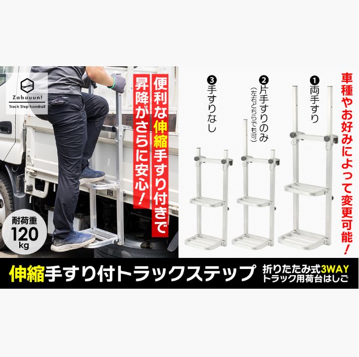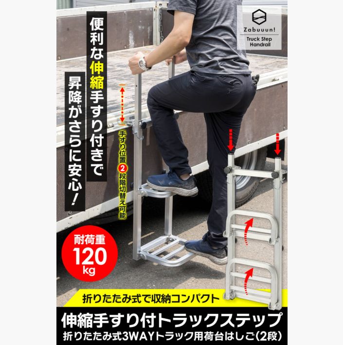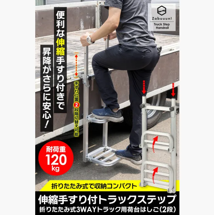 【手すり付き】折りたたみ式 トラックステップ 耐荷重120kg 2段 アルミ製 トラックラダー トラック用荷台はしご 昇降ステップ 荷台ステップ