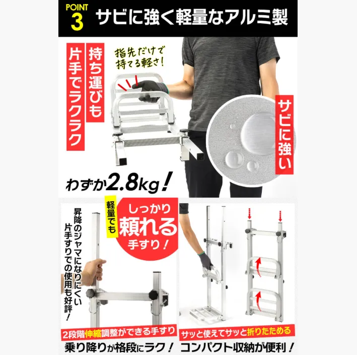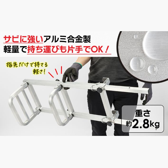 【アルミ合金製】サビに強いアルミ合金を採用しています。トラックステップは耐荷重120kgで、アルミ合金は強度が高く、弾力性にも優れているため安心して使用できます。軽量設計(約2.8kg)なので持ち運びや取扱が非常に楽です。錆びにくいので平ボディでの荷台保管など、屋外使用にも最適です。