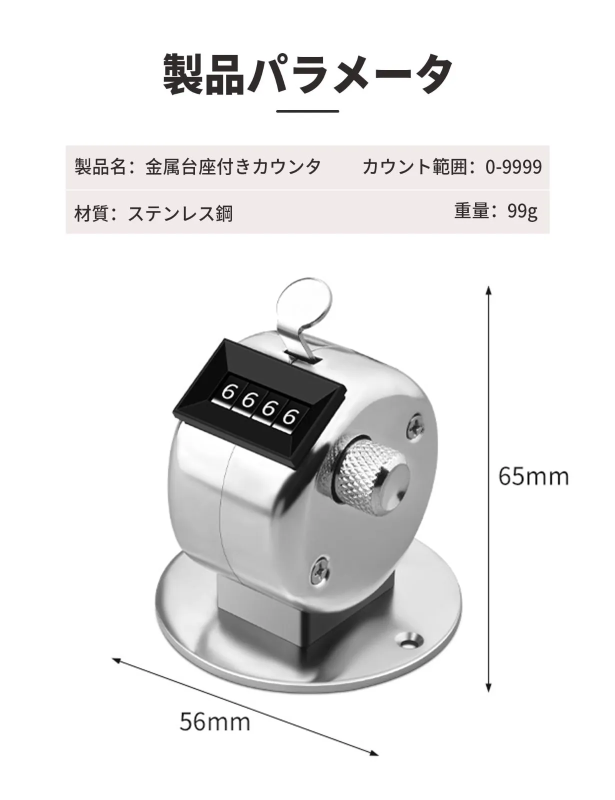 【商品仕様】材質:金属。サイズ:65mm*56mm。重量:99グラム。タイプ:卓上型。測定範囲:0~9999(4桁)。