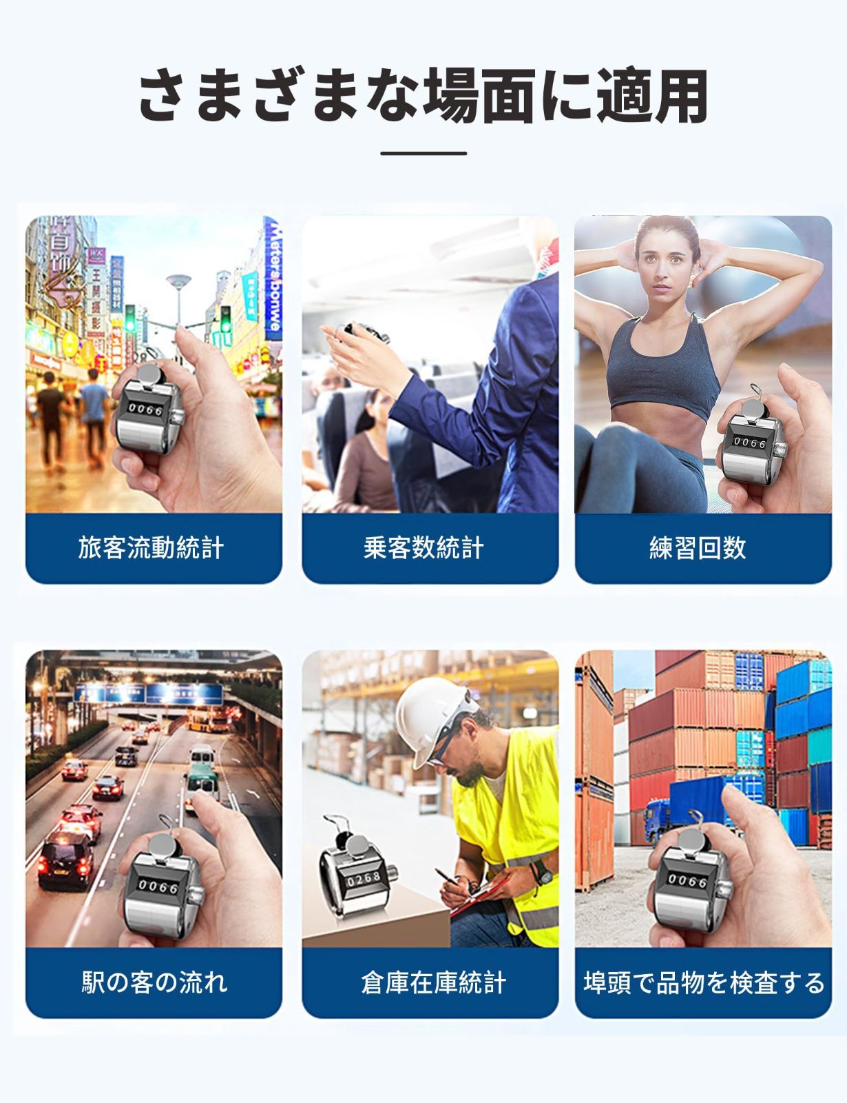 【様々な用途にも】 統計の機会に広く適用されます。交通量、数取り、入場者数、野鳥の観察、スポーツ用、業務用、学習用、人員確認、交通量調査、製品の検品、データ、スポーツシーン、パーティー、会議、レストラン、学校、研究室、教会、競技会、スタジアム、バー等の分類計数等に使用されます。また、子供たちが数えることを学ぶのを助けることができます。