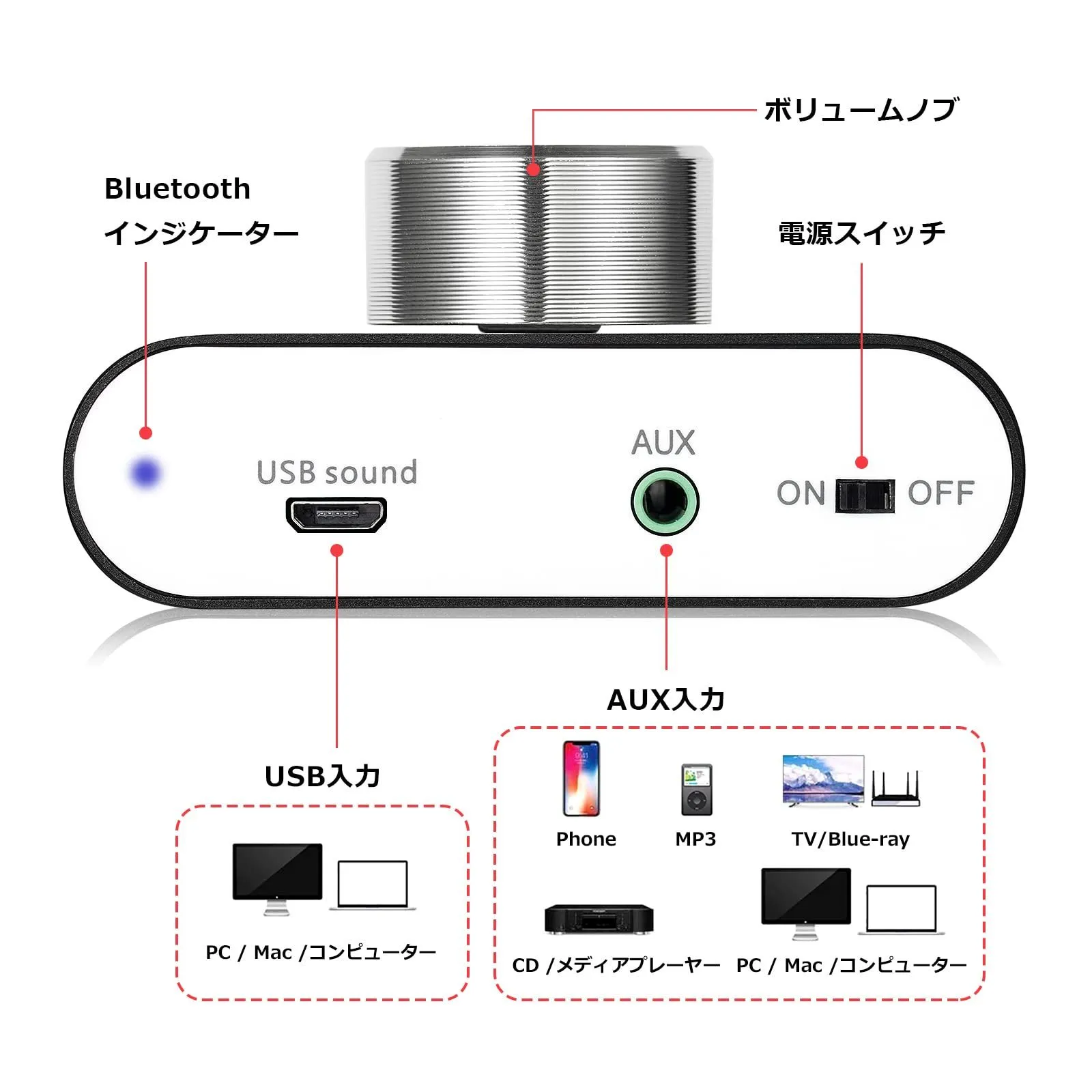 Bluetooth 5.0/3.5mm AUX/USB入力により、スマホ、タブレット、PC、テレビ、CDプレーヤー、デコーダー、プリアンプ等に簡単に接続することができます。 USB入力はドライバーの必要がありません、非常に便利です。