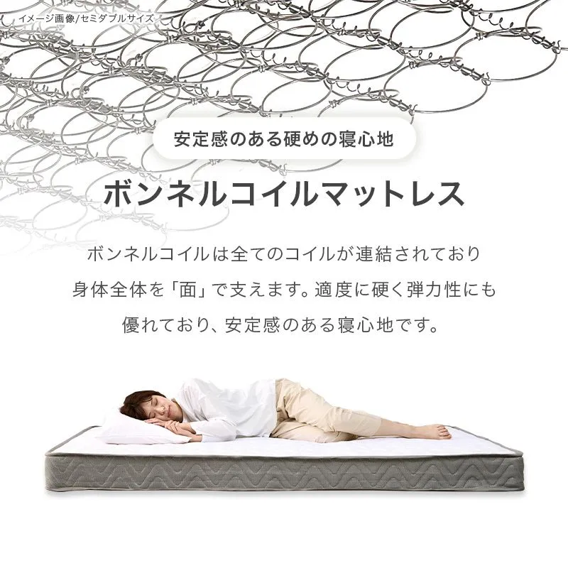 【素材】 ベッド:<主材>天然木(ラバーウッド)・プリント化粧パーティクルボード、 マットレス:<主材>ボンネルコイル<張地>ポリエステル