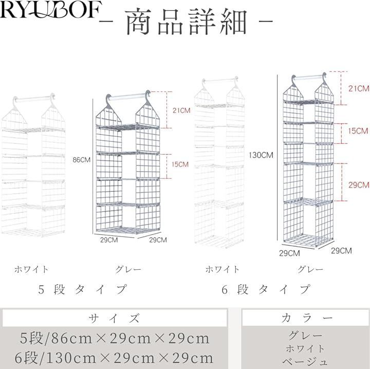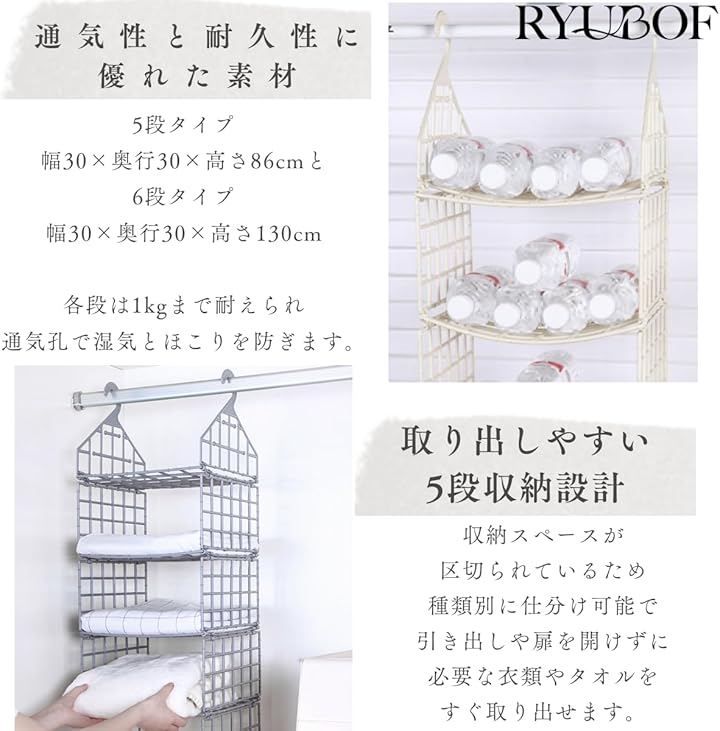 「通気性と耐久性に優れた素材」幅29x奥行29x高さ86cmの5段タイプと幅29x奥行29x高さ130cmの6段タイプを用意し、各段は1kgまで耐えられ通気孔で湿気とほこりを防ぎます。