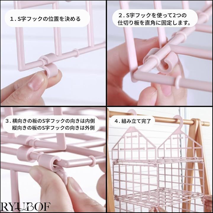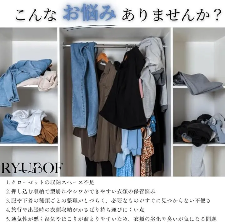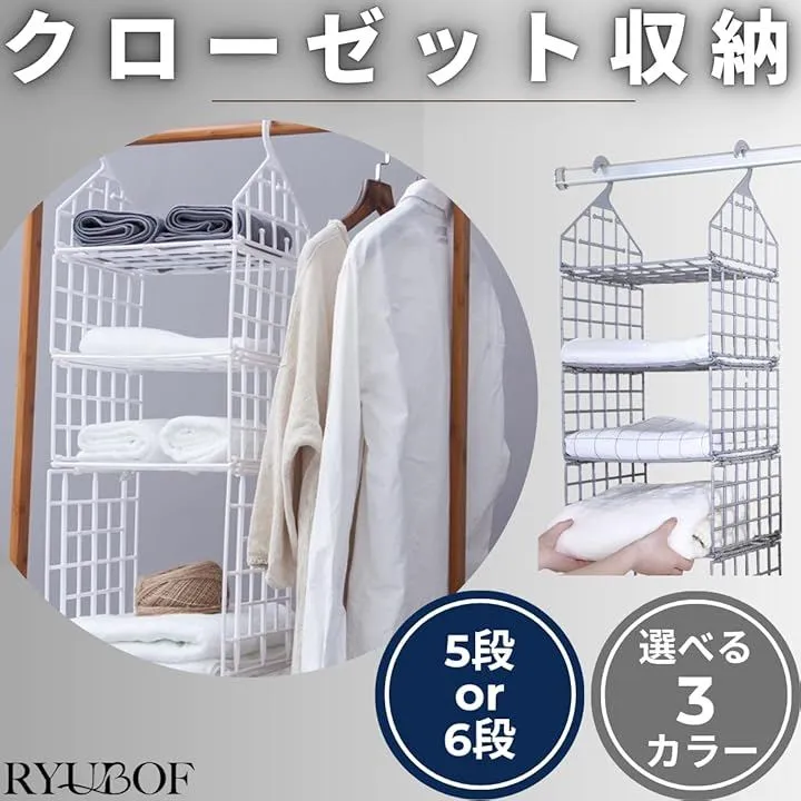 「クローゼットの省スペース活用」吊り下げ収納は衣類を吊るしやすく整理を簡単にし、クローゼット内のスペースを節約して余裕ある収納空間を作り出します。