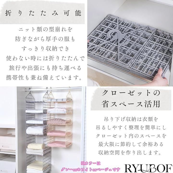 「大容量で折りたたみ可能」ニット類の型崩れを防ぎながら厚手の服もすっきり収納でき、使わない時には折りたたんで旅行や出張にも持ち運べる携帯性も兼ね備えています。
