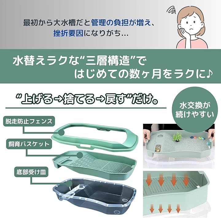こまめな水替えと観察がしやすく、成長後は給餌・隔離・通院時のサブタンクとして活躍します。