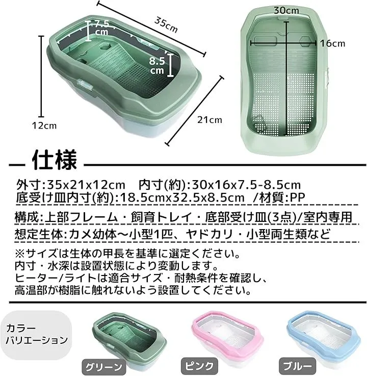 底受け皿内寸:18.5cmx32.5x8.5cm/材質:PP/カラー:グリーン 構成:上部フレーム・飼育トレイ・底部受け皿(3点) 想定生体:カメ幼体~小型1匹、ヤドカリ・小型両生類など/室内専用 *サイズは生体の甲長を基準に選定ください。