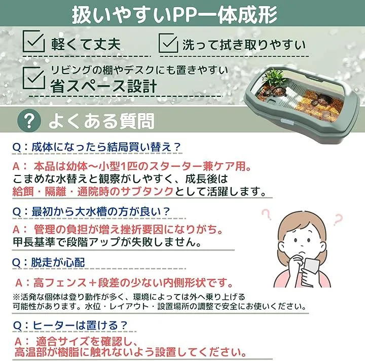 「Q&A」 Q:成体になったら結局買い替え? A: 本品は幼体~小型1匹のスターター兼ケア用。