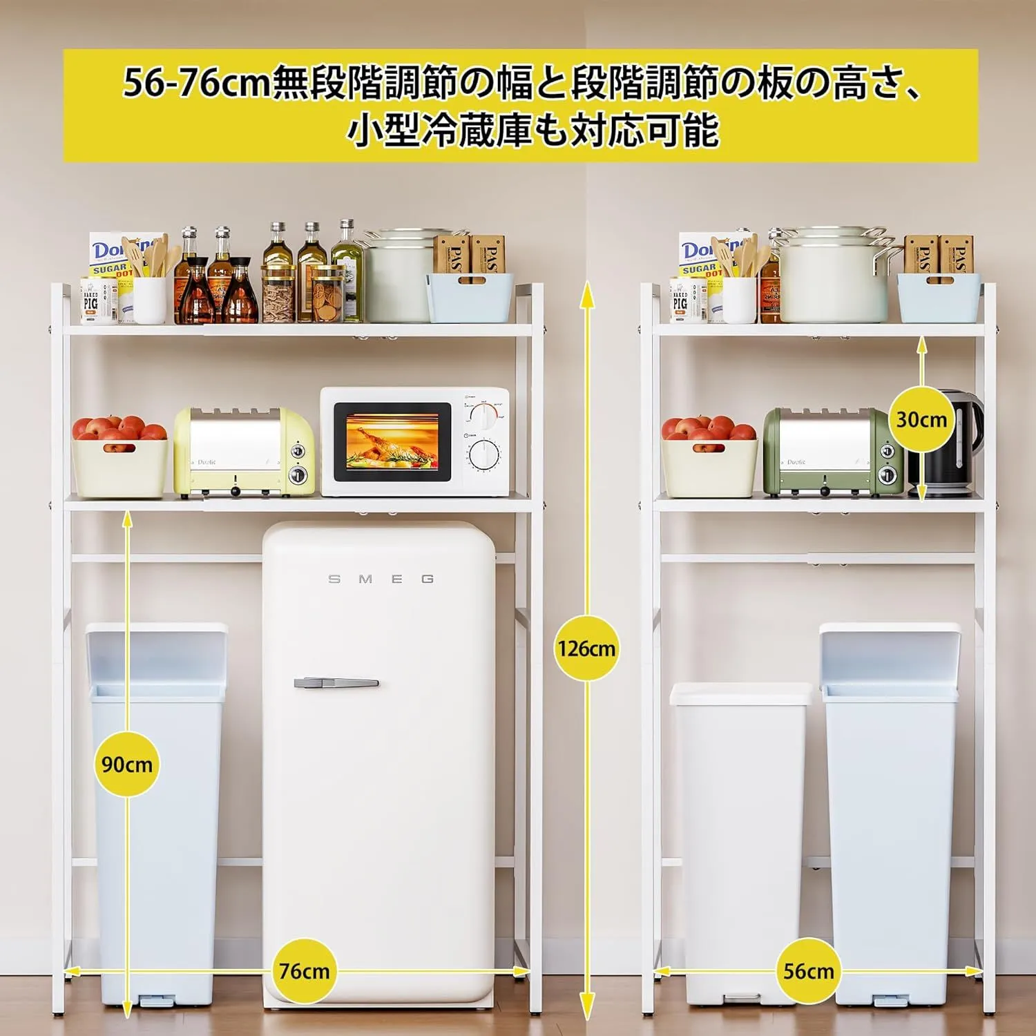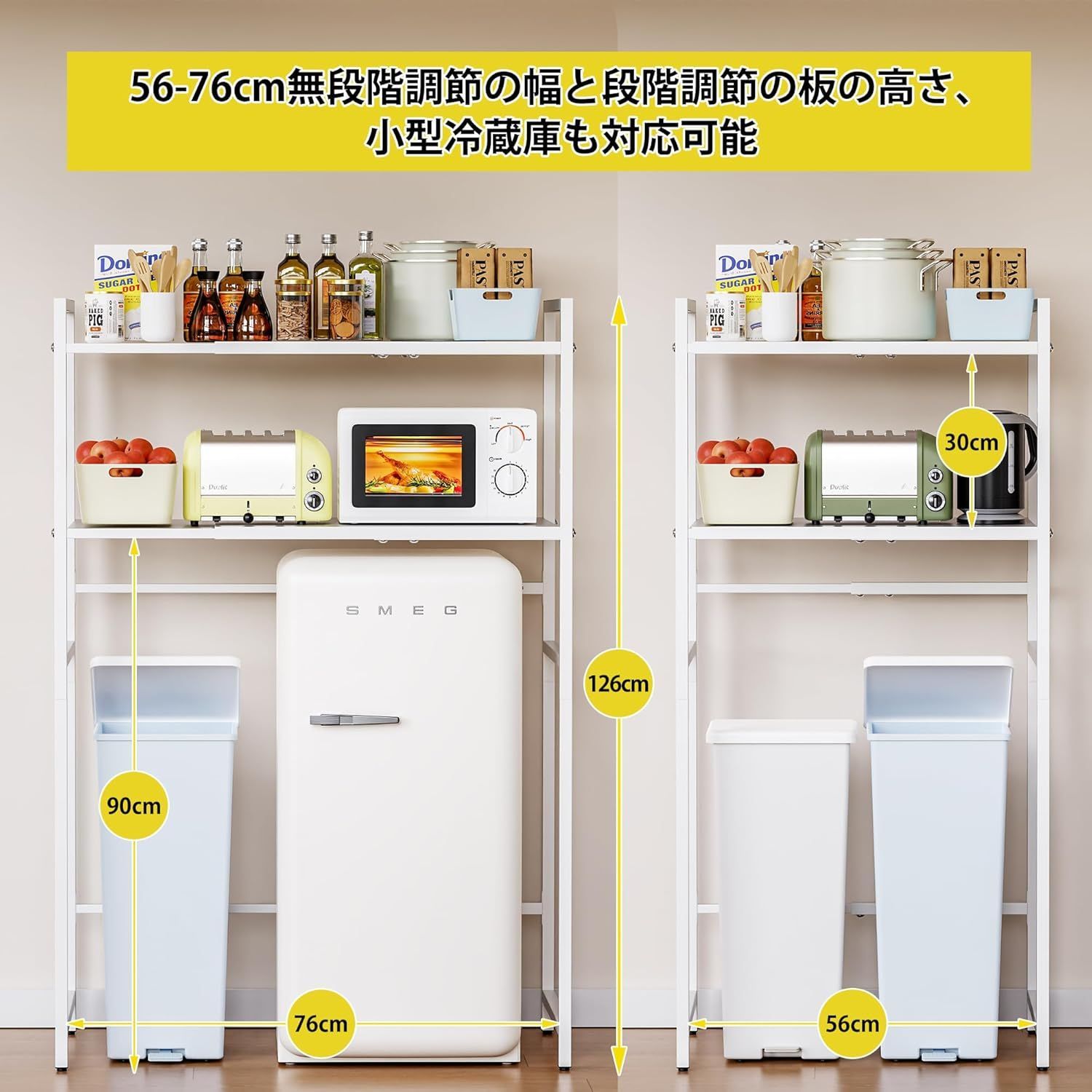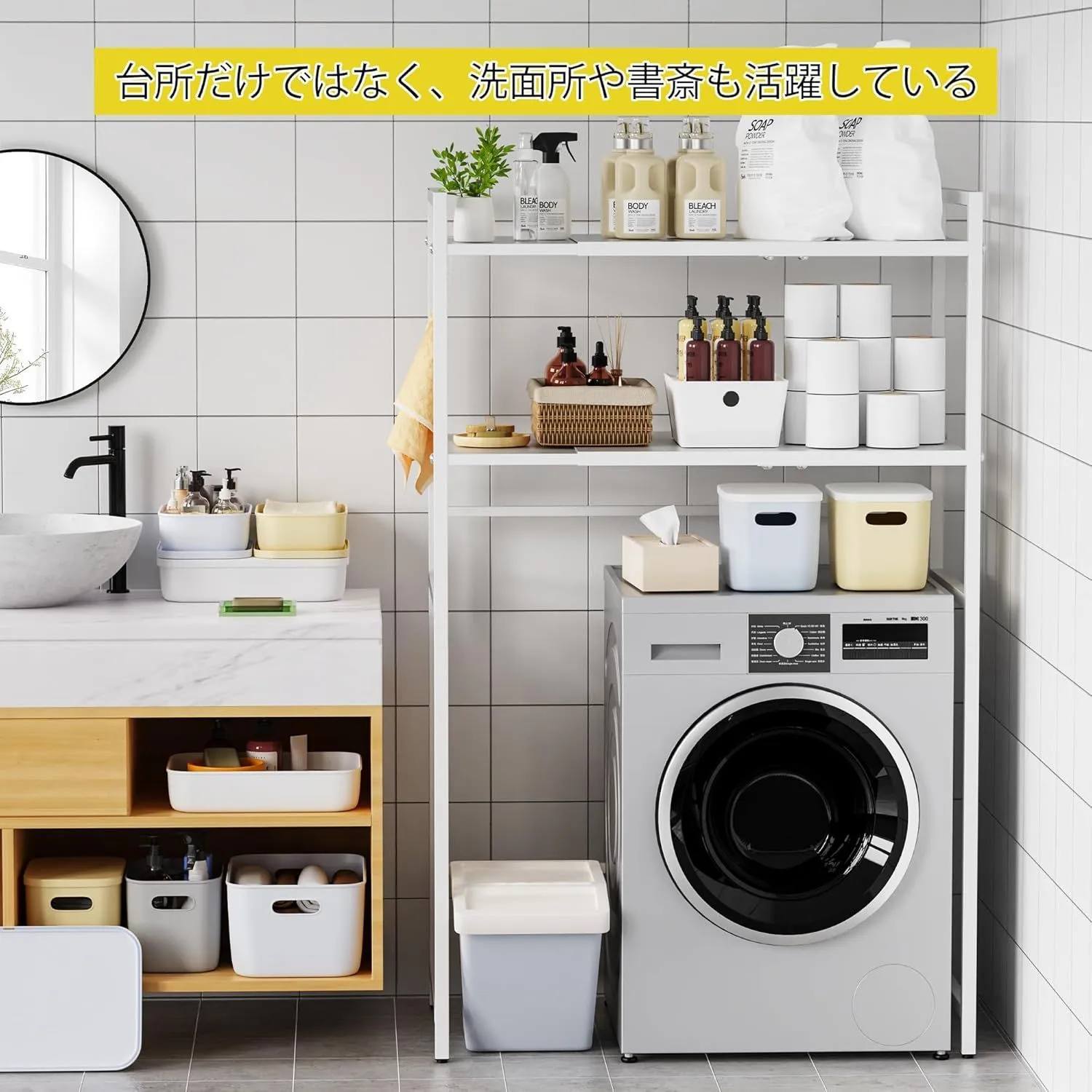 「多シーンに対応」このラックはキッチン、トイレ、リビングなど様々なシーンで使えます。ラックの下のスペースには、多シーンによって、小型冷蔵庫や洗濯机、ゴミ箱を対応できます。部屋スペースを賢く活用し、限られた空間を広げます!
