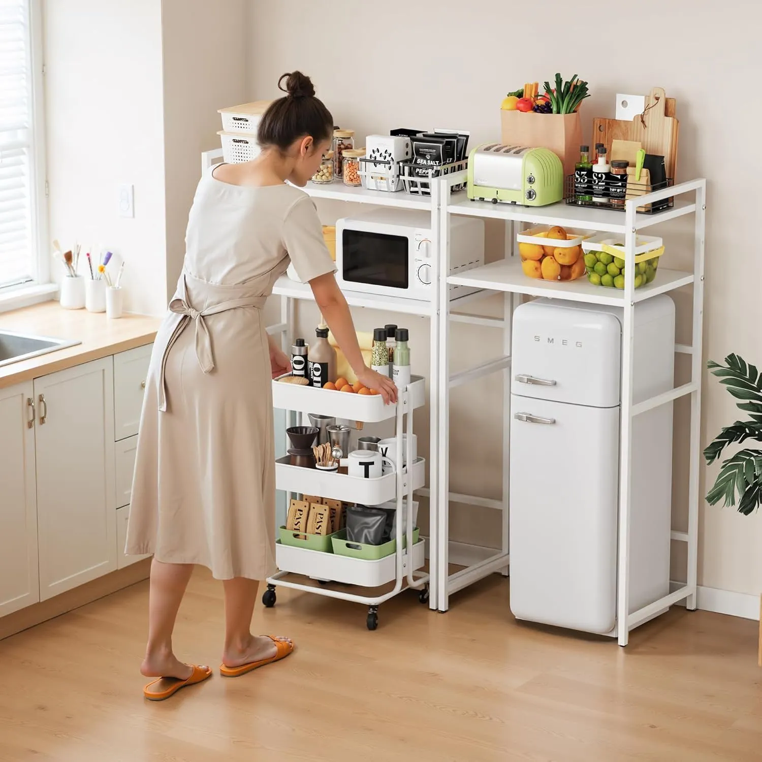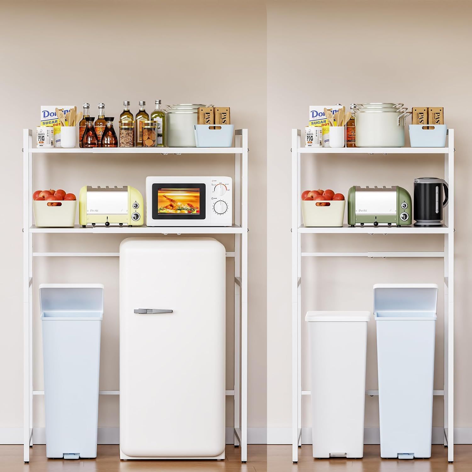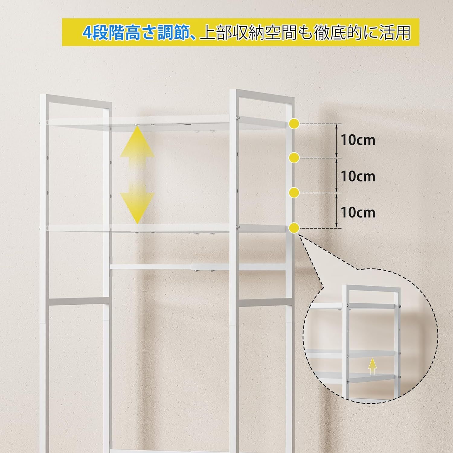 「多シーンに対応」このラックはキッチン、トイレ、リビングなど様々なシーンで使えます。ラックの下のスペースには、多シーンによって、小型冷蔵庫や洗濯机、ゴミ箱を対応できます。部屋スペースを賢く活用し、限られた空間を広げます!