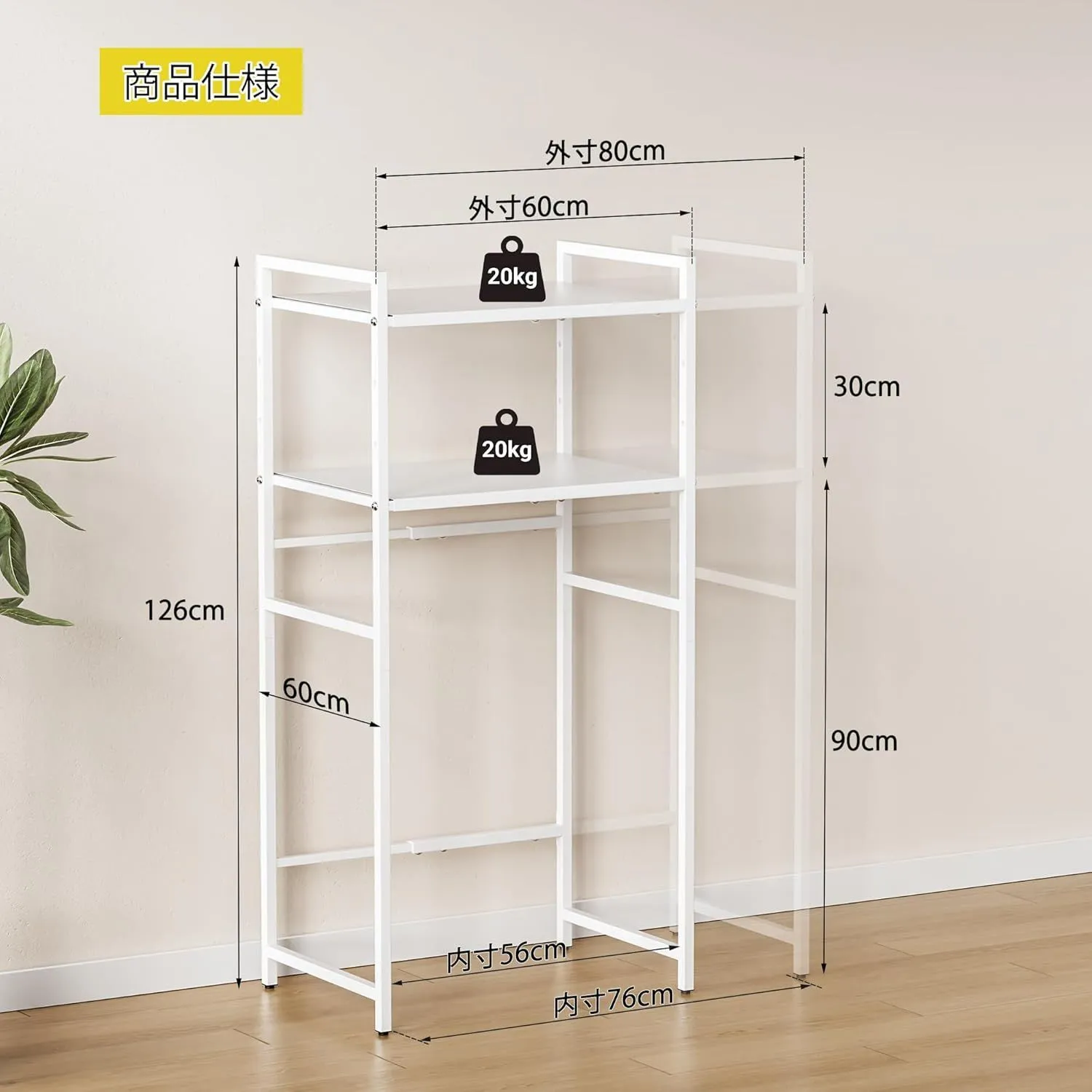 「商品仕様」商品サイズ:幅60×奥行40×高さ193cm、天板サイズ:幅56×奥行40cm。各層耐荷重:約25KG、総重量:15.5KG。ランク下の空間のサイズ 内寸:約幅56*38*118cm (注意:対応サイズを必ずご確認ください)