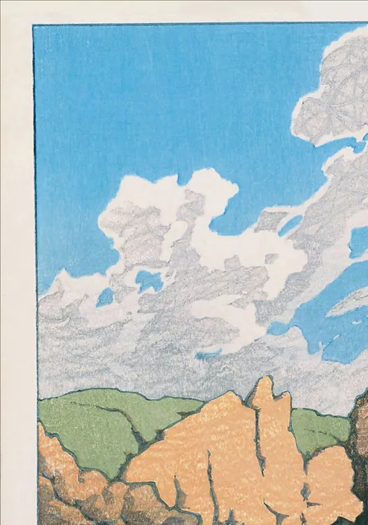 ■ 作者:川瀬巴水 (かわせ はすい 1883年~1957年) 大正から昭和にかけて活躍した版画家。 新しい浮世絵版画である新版画を確立した人物。 日本各地で写生したスケッチを元に木版画作品を数多く発表。 川瀬巴水の初期の作品は、ギザギザした輪郭線や抑揚がある線を用い、陰影を強調するような作風が特徴です。また「ザラ摺」の手法(円弧を描くようなバレンの摺り跡をつける手法)をあえて残すなど、挑戦的な試みも行っています。