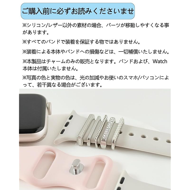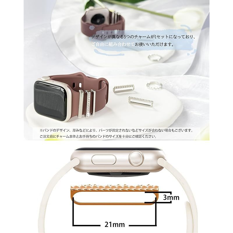 【商品説明】 この アップルウォッチ バンド 用アクセサリーはシリコンバンド/レザーバンドに適しています。幅21mm未満、厚さ3mm未満の時計バンドに適しています。あらゆる場面、オフィス、レジャー、パーティーに適しています。この アップルウォッチ アクセサリー チャーム はデザインが異なる複数のチャームが1セットになっており、ご自由に組み合わせてお使いいただけます。服、アクセサリー、バッグに合わせて繰り返し使用することもでき、シンプルで華やかに変身します。ウォッチスト バンド に直接取り付け、その日の気分で自分らしく可愛くアレンジできます!ベルトに通すだけで簡単に取り付け可能。ワンポイントタイプのチャームはベルト穴に差し込むだけ!※本製品は時計バンドチャームのみの販売となります。バンドおよび、Apple Watch 本体は付属いたしません。※すべてのバンドで装着を保証する物ではありません。※装着による本体やバンドへの損傷などは、一切補償いたしません。※金属による反射、光の加減やパソコンなどにより少し色合いが異なる場合がございます。※バンドに装着をすると金属部が腕に触れる状態になりますので、金属アレルギーのある方はご利用の際にご注意ください。※汚れや水、手の油分などを付着したままにすると、変色やサビの原因になります。汚れは乾いた布で乾拭きしてください。※製品の仕様は予告なく変更されることがあります。