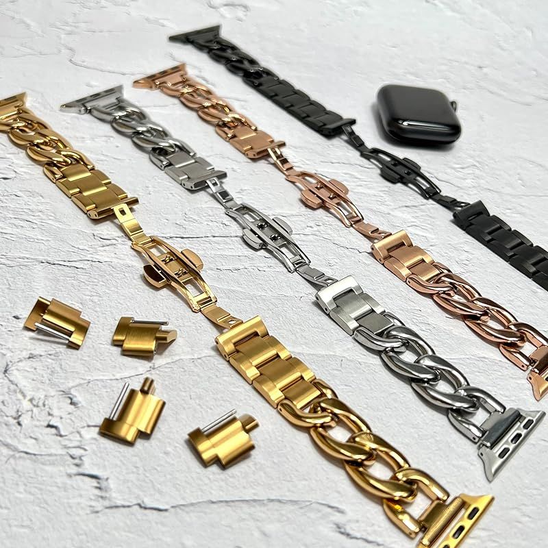【全機種対応】対応機種:Apple Watch Series 11 , 10 , 9 , 8 , 7 , 6 , 5 , 4 , SE ,Ultra 3.2.1 /サイズ:40 . 41 . 42 . 44 . 45 . 46 . 49mm対応 / ご希望のサイズをお選びください。 / 付属品:輸送用ボックス、コマ調整説明書 ※アップルウォッチ本体は付属しません。※ゴールドカラー、ピンクゴールドカラーはチェーンが重なり合う部位は塗装が薄れシルバーに近い色味となりますが、不良品ではございません。装着時には露出しない部位となります。コマ調整の際は、コマサイドのパーツを真っ直ぐ引き出し回転させて下さい。