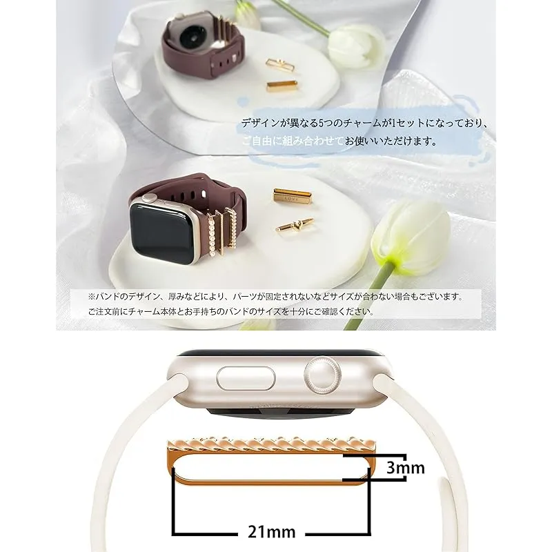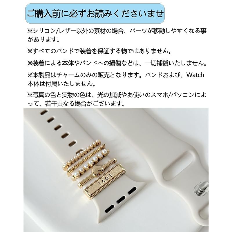 【商品説明】 この アップルウォッチ バンド 用アクセサリーはシリコンバンド/レザーバンドに適しています。幅21mm未満、厚さ3mm未満の時計バンドに適しています。あらゆる場面、オフィス、レジャー、パーティーに適しています。この アップルウォッチ アクセサリー チャーム はデザインが異なる複数のチャームが1セットになっており、ご自由に組み合わせてお使いいただけます。服、アクセサリー、バッグに合わせて繰り返し使用することもでき、シンプルで華やかに変身します。ウォッチスト バンド に直接取り付け、その日の気分で自分らしく可愛くアレンジできます!ベルトに通すだけで簡単に取り付け可能。ワンポイントタイプのチャームはベルト穴に差し込むだけ!※本製品は時計バンドチャームのみの販売となります。バンドおよび、Apple Watch 本体は付属いたしません。※すべてのバンドで装着を保証する物ではありません。※装着による本体やバンドへの損傷などは、一切補償いたしません。※金属による反射、光の加減やパソコンなどにより少し色合いが異なる場合がございます。※バンドに装着をすると金属部が腕に触れる状態になりますので、金属アレルギーのある方はご利用の際にご注意ください。※汚れや水、手の油分などを付着したままにすると、変色やサビの原因になります。汚れは乾いた布で乾拭きしてください。※製品の仕様は予告なく変更されることがあります。