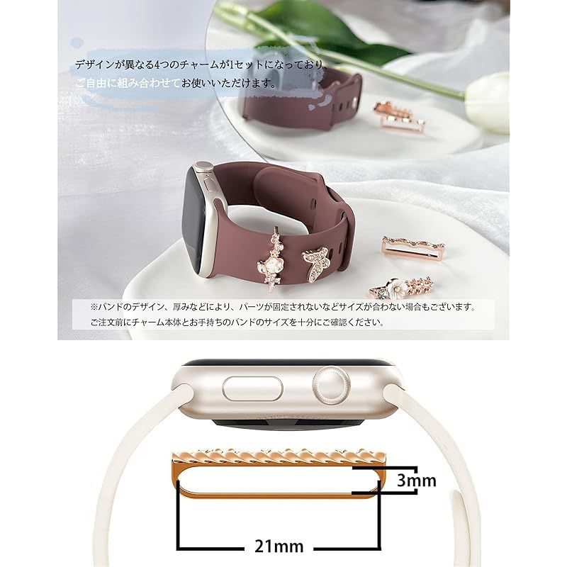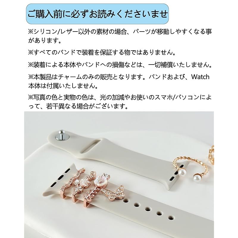 【商品説明】 この アップルウォッチ バンド 用アクセサリーはシリコンバンド/レザーバンドに適しています。幅21mm未満、厚さ3mm未満の時計バンドに適しています。あらゆる場面、オフィス、レジャー、パーティーに適しています。この アップルウォッチ アクセサリー チャーム はデザインが異なる複数のチャームが1セットになっており、ご自由に組み合わせてお使いいただけます。服、アクセサリー、バッグに合わせて繰り返し使用することもでき、シンプルで華やかに変身します。ウォッチスト バンド に直接取り付け、その日の気分で自分らしく可愛くアレンジできます!ベルトに通すだけで簡単に取り付け可能。ワンポイントタイプのチャームはベルト穴に差し込むだけ!※本製品は時計バンドチャームのみの販売となります。バンドおよび、Apple Watch 本体は付属いたしません。※すべてのバンドで装着を保証する物ではありません。※装着による本体やバンドへの損傷などは、一切補償いたしません。※金属による反射、光の加減やパソコンなどにより少し色合いが異なる場合がございます。※バンドに装着をすると金属部が腕に触れる状態になりますので、金属アレルギーのある方はご利用の際にご注意ください。※汚れや水、手の油分などを付着したままにすると、変色やサビの原因になります。汚れは乾いた布で乾拭きしてください。※製品の仕様は予告なく変更されることがあります。