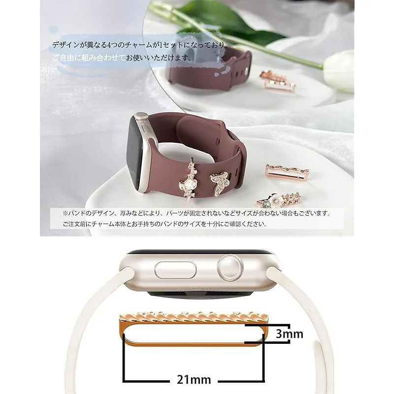 【適用モデル】このアップルウォッチ アクセサリー チャーム はシリコンバンド/レザーバンドに適しています。幅21mm未満、厚さ3mm未満の時計バンドに適しています。あらゆる場面、オフィス、レジャー、パーティーに適しています。