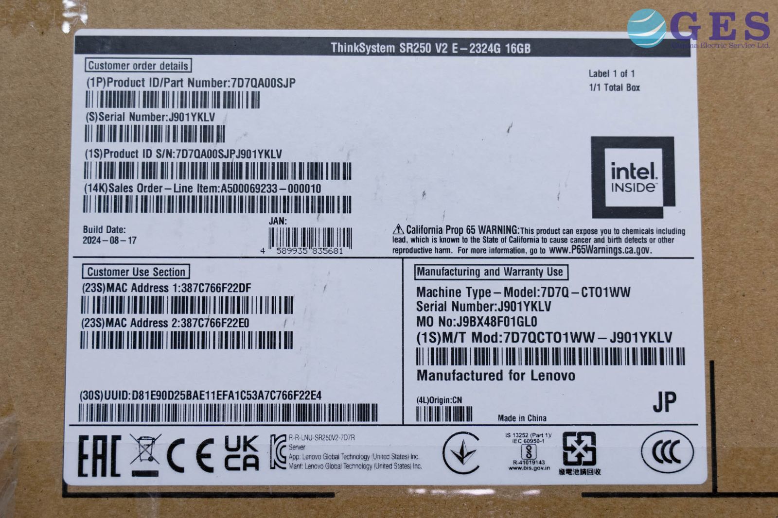 【未使用品】Lenovo ThinkSystem SR250 V2 7D7QAS00SJP XeonE-2324G/16GB
