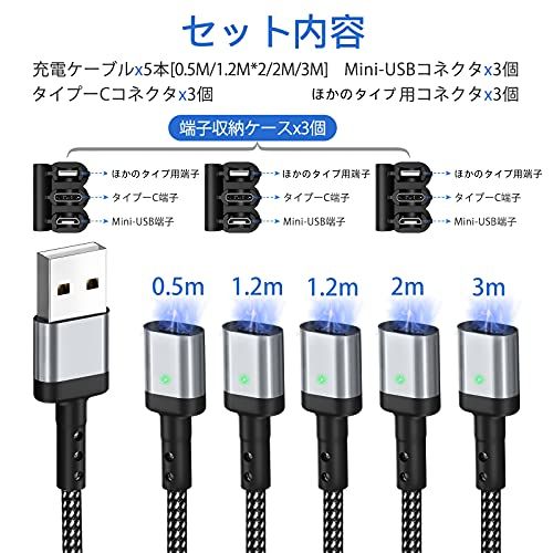 【0.5M 1.2M 1.2M 2M 3M】QC3.0/3A急速充電 USB2.0高速データ転送 磁石 磁気 防塵 着脱式 マイクロUSB Type-C コネクタ タイプc Micro USB Cable LEDインジケーター付き 磁気端子収納ケース付き - SYCX001 (5本セット&9個マグネット端子)t ご覧いただきありがとうございます 即購入OK! 丁寧な梱包・発送でお届けいたします。 よろしくお願い致します