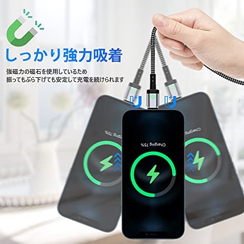 【3A高速充電&データ転送対応】 強力なマグネット式ケーブルで、安定した3A急速充電を実現。充電時間を短縮し、効率よくデバイスをリフレッシュできます。さらに、480Mbpsのデータ転送にも対応しており、写真や音楽の移動もスムーズ。先端にはLEDライトを搭載しているため、暗い場所でも一目で接続位置が分かります。