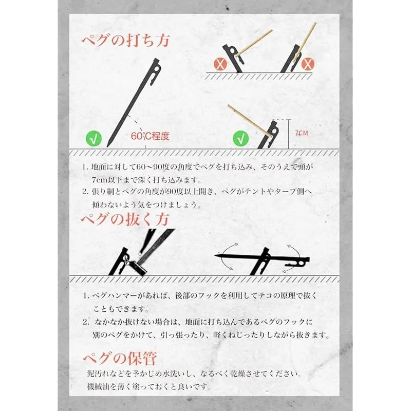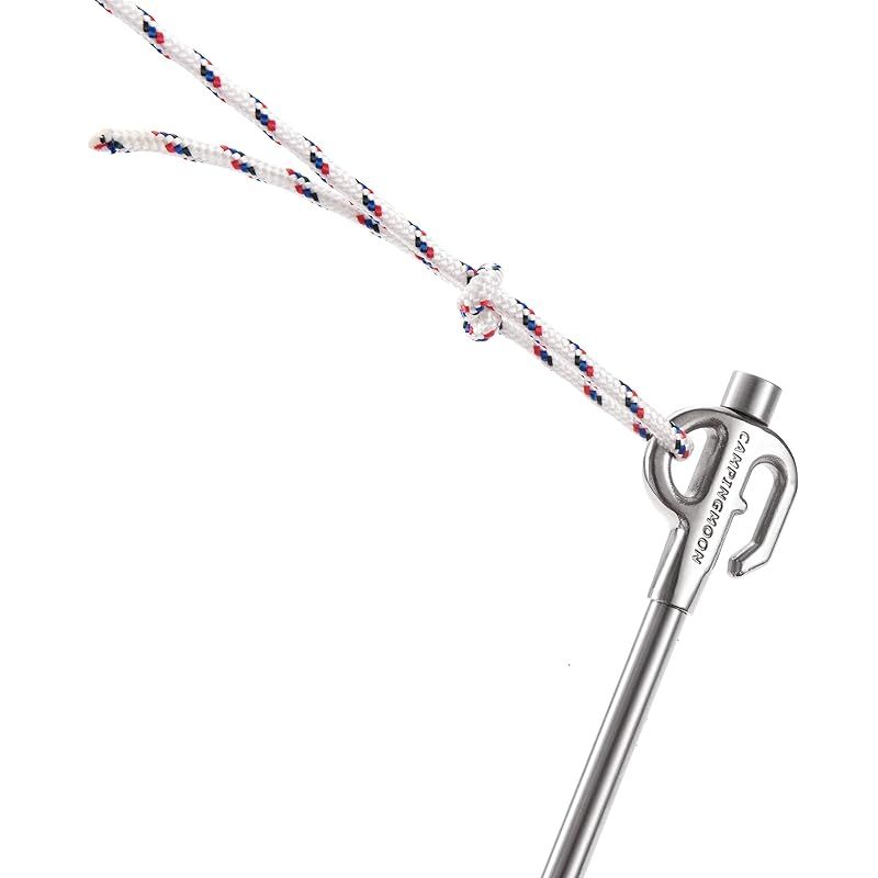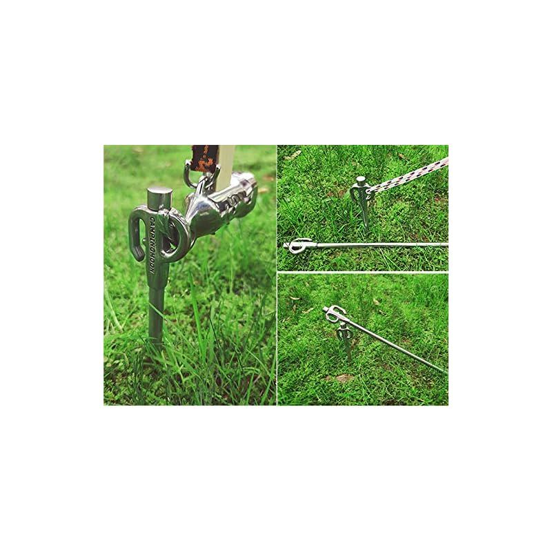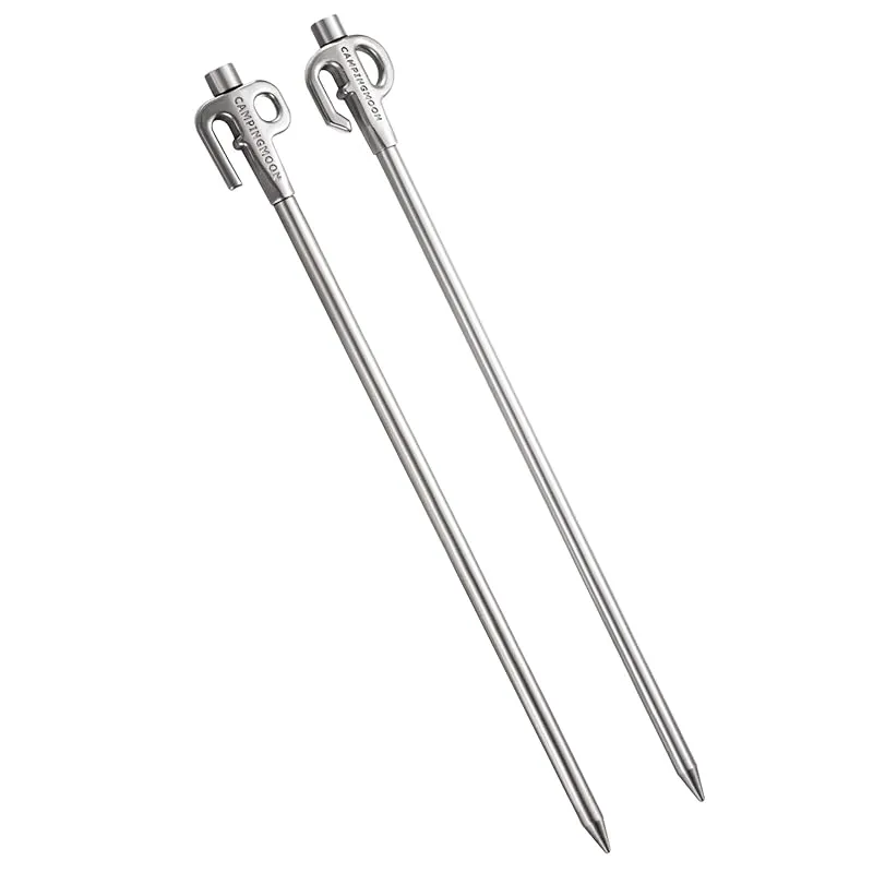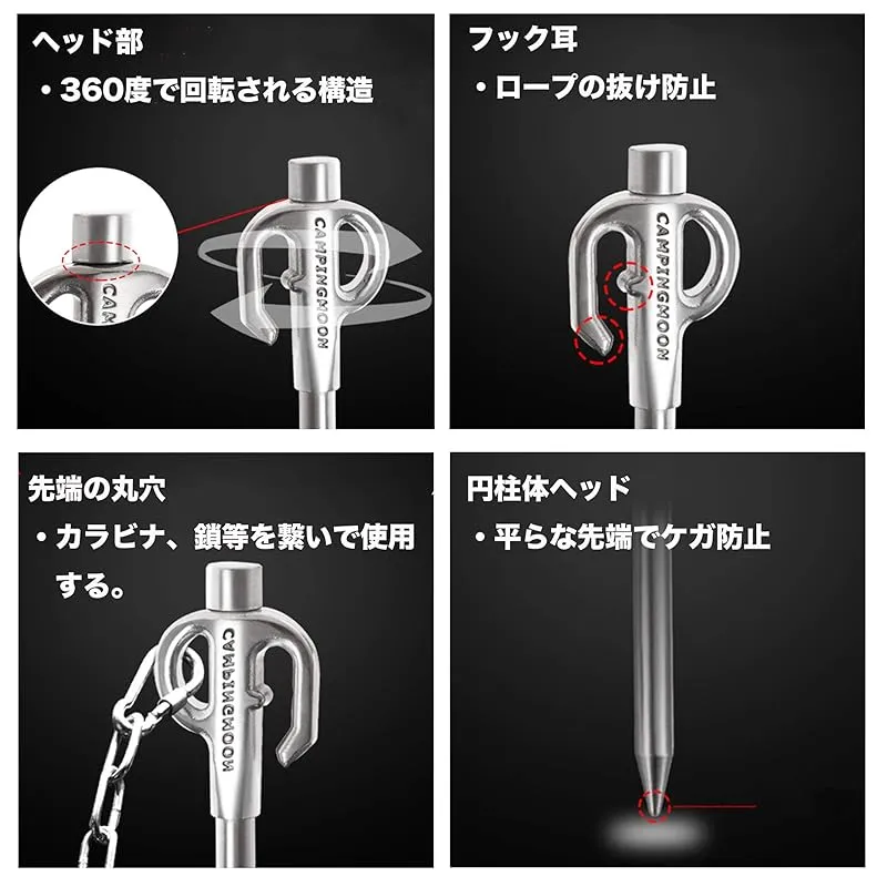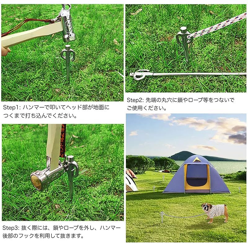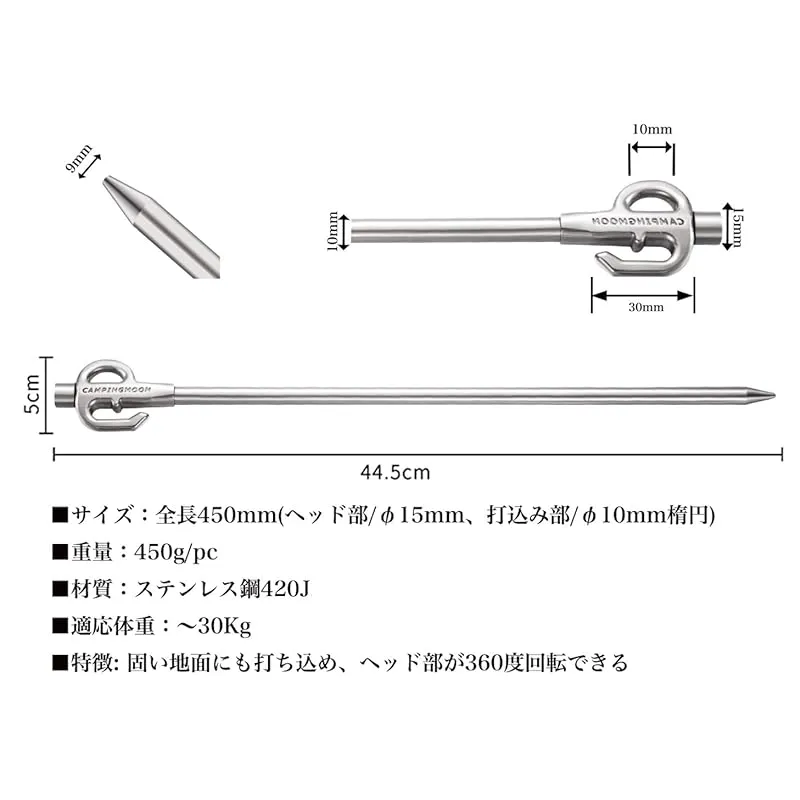 【商品概要】 サイズ:全長450mm(ヘッド部/φ15mm、打込み部/φ10mm楕円) 重量:450g/本 (計2本) 材質:ステンレス鋼420J 適応体重:?30Kg 特徴:固い地面にも打ち込め、ヘッド部が360度回転できる