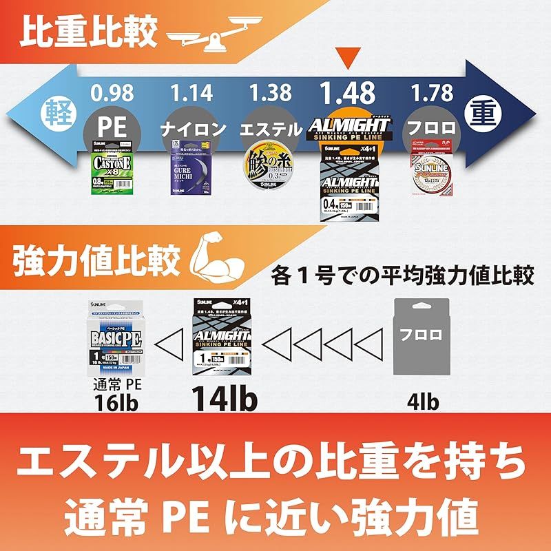 【オールマイト (ALMIGHT) オレンジ&マーキング】……「比重 1.48」の重さが生み出す操作感!! 「ULT-PE素材 4本+高比重繊維コア(芯)内蔵」のシンキングPEライン!! 「比重 1.48」により強風・早い潮の中でも、直進性が高まりルアーの操作性が大幅向上!! 明るい色調で視認性に優れた「オレンジ」は、ラインの存在感を高める全天候対応型の高視認性カラー!!