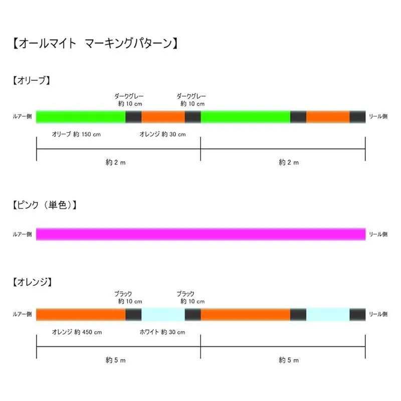 【オールマイト (ALMIGHT) オレンジ&マーキング】……「比重 1.48」の重さが生み出す操作感!! 「ULT-PE素材 4本+高比重繊維コア(芯)内蔵」のシンキングPEライン!! 「比重 1.48」により強風・早い潮の中でも、直進性が高まりルアーの操作性が大幅向上!! 明るい色調で視認性に優れた「オレンジ」は、ラインの存在感を高める全天候対応型の高視認性カラー!!