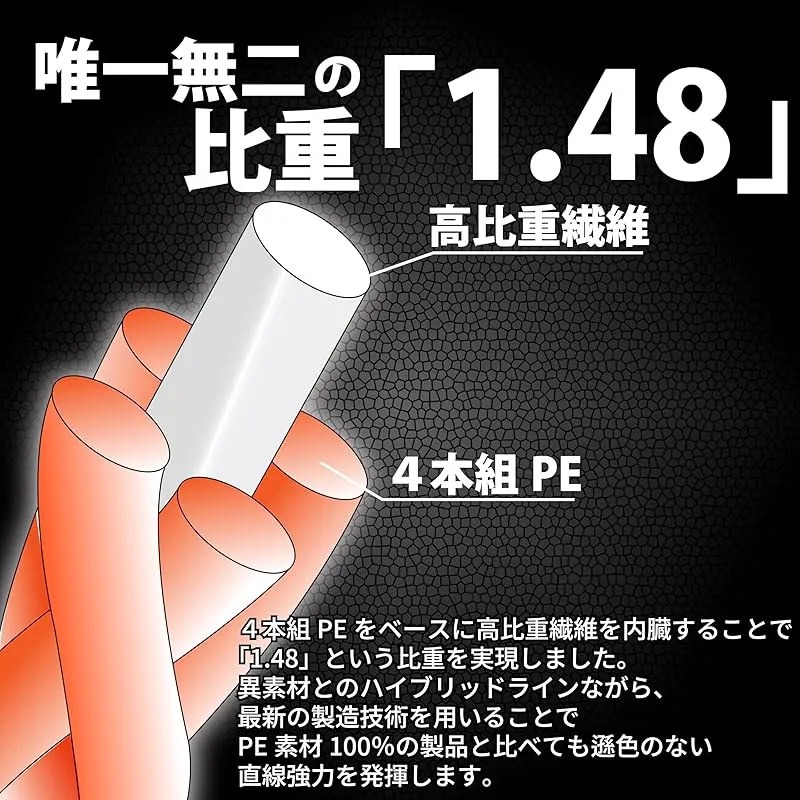 【商品概要】 巻数: 150m サイズ: 1.2号 / MAX強度:8.4kg(18.5LB)- アベレージ強力値 17lb カラー: オレンジ×ブラック・ホワイトマーキング (5m毎 オレンジ 450cm+ブラック10cm+ホワイト30cm+ブラック10cm) 素材:シンキング PEライン (ULT-PE 4本撚り+高比重繊維 芯 1本) / 特徴: 「アルティメットPE タイプIII」「比重 1.48」「日本製」 シリーズ: