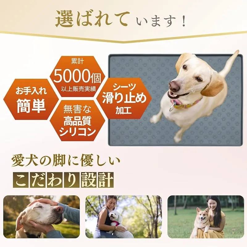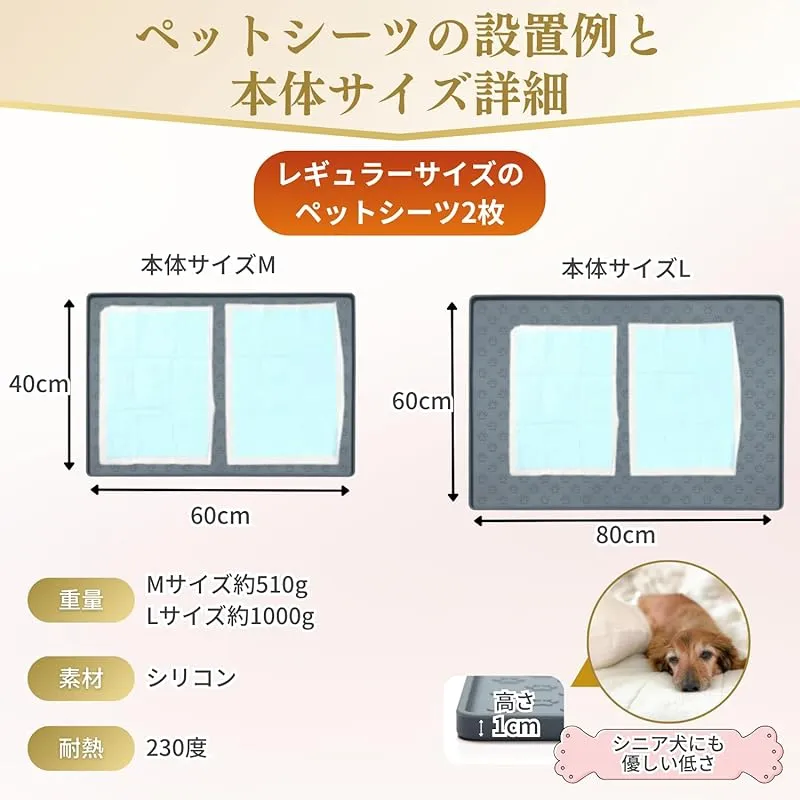 【商品概要】 エッジデザイン: 6mmの余裕のある高さのエッジは液体がこぼれる心配が無く、角の部分は丸めに仕上げられており、汚れも容易に取れます。 滑らない加工: 密着力が強いシリコンマットは排便パッドを乗せても散らばる心配が無く便利です。 環境にやさしい: 100%シリコン素材で作られ、匂いも無く、環境ホルモンの心配もないのでペットの食事用のマットとしても活用できます。 お手入れ簡単: 耐熱性が高いシリコン素材で、230℃の高温のお湯での熱湯消毒にも対応できます。プニプニしたシリコン素材のため、洗浄も形態も容易です。