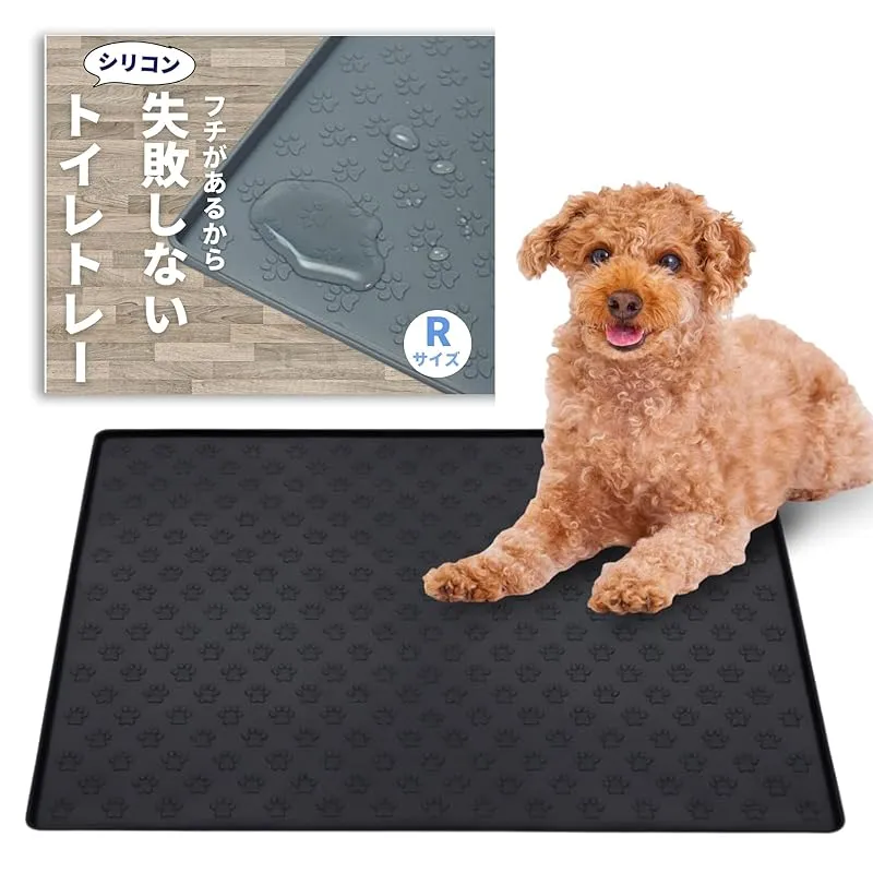 JON TORUDO 犬 トイレトレー シリコン 【可愛い肉球柄 & エッジ加工で漏れ安心】 トイレマット ワイド ペットシーツ はみ出し防止 お手入れ簡単 (ブラック, R(40×60cm))