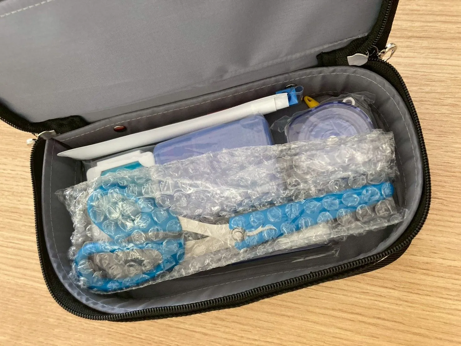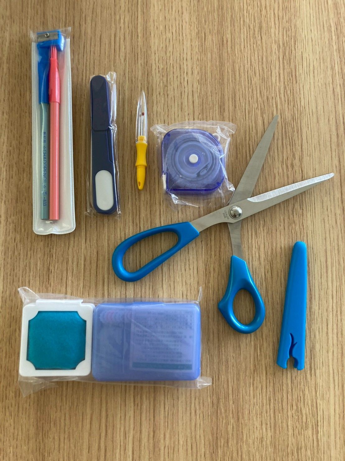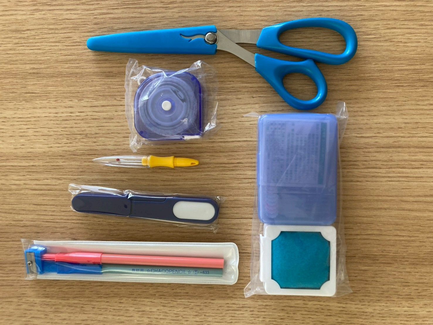 ●針セット (・ミシン針(No.14)×1本 (・セル待針×10本 (・長針×2本 (・中針×1本 (・刺しゅう針(No.5)×1本 (・みじか針×2本 (・縫い糸×5色 (・指ぬき(長針用・短針用)×各1個 (・ひも通し×1 (・糸通し×1 (・さびどめ紙×1 (・名前シール