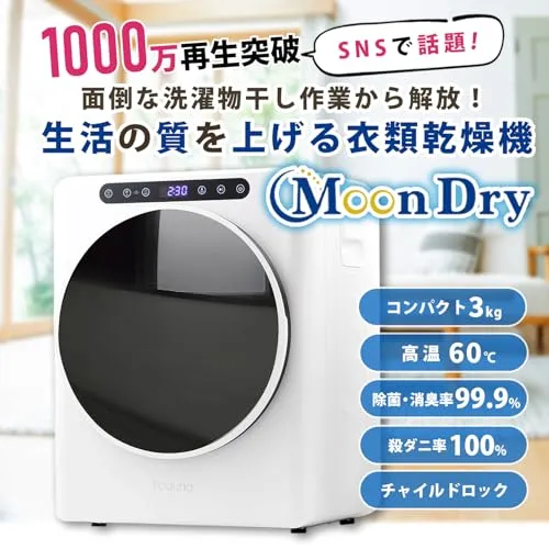 【Moon Dry ムーンドライ 3kg】 Yoquna 衣類乾燥機 3kgモデル。操作パネル位置下部は、操作パネル上部の機能に加えてポリエステル用・下着用など各素材に特化したモードを追加したモデルです。