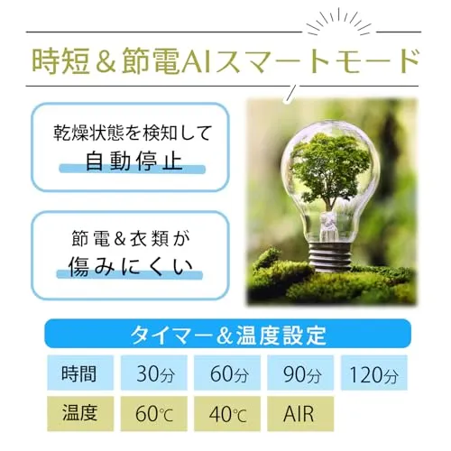 【最新のタッチパネル】操作はタッチパネル式で日本語表記で扱いやすい設計です。タイマーは30分/60分/90分/120分の四段階一段階(AIスマートモードは最大150分で乾燥検知で早期終了)。温度は60/40/冷風の3段階AIスマートモード(最大55乾燥自動検知終了モード)があります。