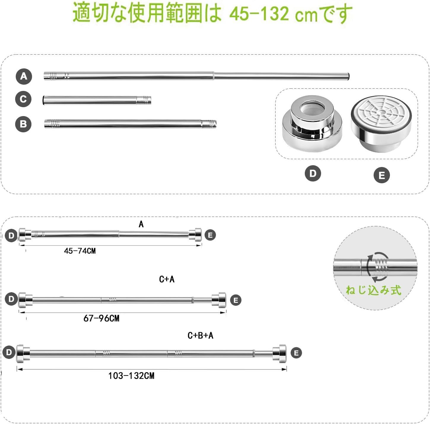 突っ張り棒 強力 45-132cm 押入れつっぱり棒極太 ステンレス 強い負荷 ドリル不要 伸縮棒 長さ調節可能 最大耐荷重40-10kg クローゼットロッド カーテンロッド シャワーカーテンロッド 物干し竿 洗濯干し 布団干し 室内 屋外 银色