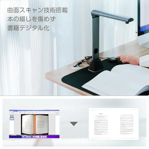 非破壊スキャンと自動補正技術:非破壊スキャン技術により、綴じたままの貴重な書籍を傷つけずにデジタル化可能なブックスキャナーです。自動めくり機能と自動平坦化技術でページの歪みを自動補正します。曲面補正機能により、分厚い教科書や雑誌など開きにくい本も平坦に再現します。背景補正・指紋除去・欠角補完を自動実行する高度な画像処理機能を搭載します。OCRスキャナーとして130言語に対応し、スキャンと同時に検索可能なPDFや編集可能なWord/Excelファイルを生成します。図書館や教育機関のアーカイブ作業を効率化します。スタンド型スキャナーとしても使用可能で、本をスキャンする際の負担を軽減します。
