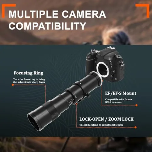 【超望遠レンズ】マニュアルフォーカス望遠レンズ(純正レンズではありません)。焦点距離420-800mm、F8.3-16固定絞り(420mm時F8.3、800mm時F16)。フィルター径62mm、フルサイズ対応、EF/EF-Sマウント。高品質素材と頑丈な構造で耐久性に優れ、長期間使用可能です。