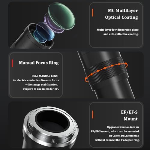【アップグレード版】EF/EF-Sマウントに改良済み(Tアダプターリング不要でCanonデジタル一眼レフカメラに直接取り付け可能)。野生動物や月の撮影愛好家に最適なレンズです。