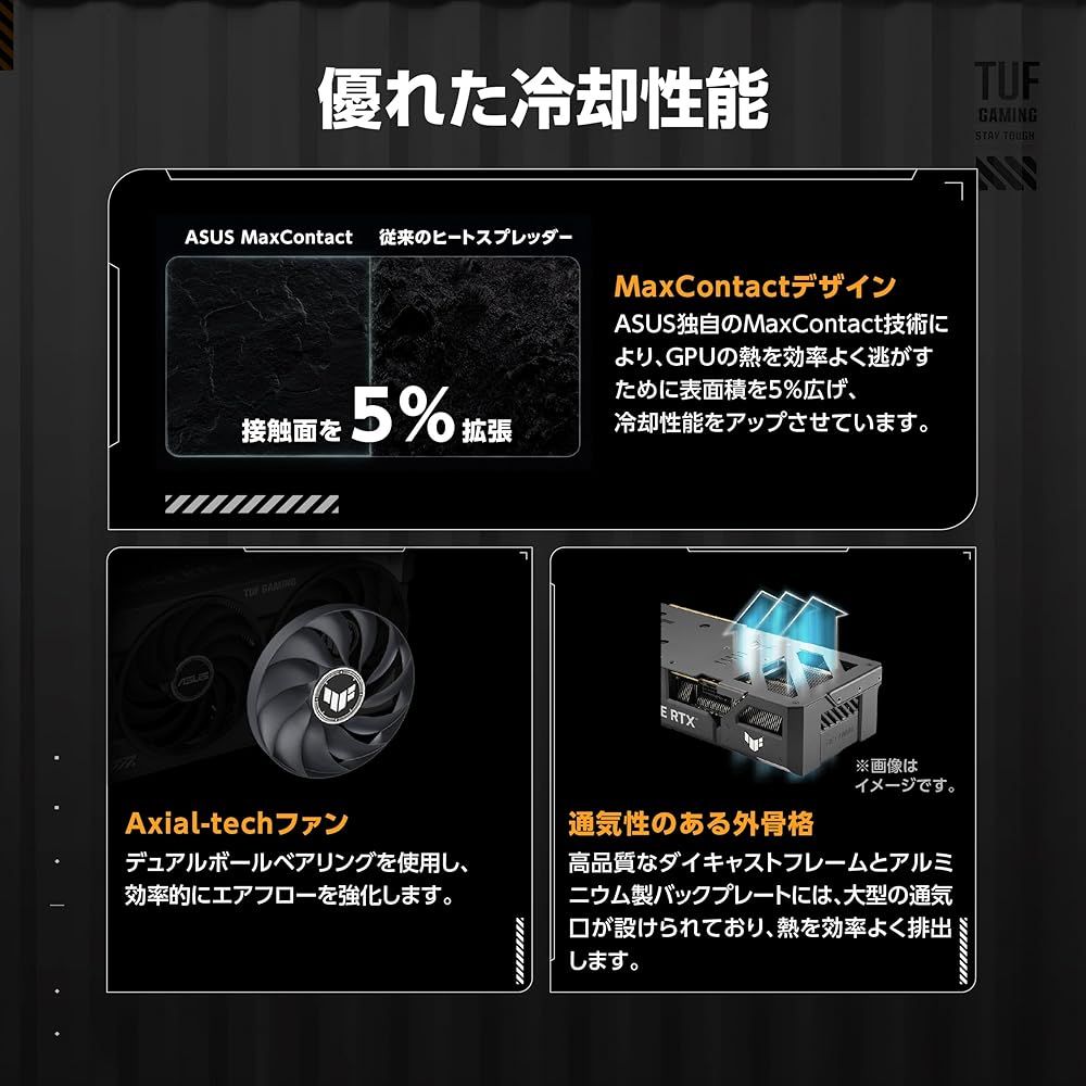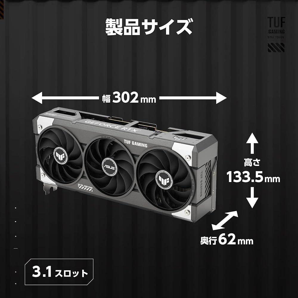 最大解像度:7680 x 4320 / 最大同時画面出力数:4 / サイズ :カード: 302 x 133.5 x 62mm / 専有スロット: 3.1 Slot 「主な仕様」MaxContactデザイン:ASUS独自の製造プロセスで、GPUのヒートスプレッダの表面積を5%拡大。強力なヒートシンクとAxial-techファンと組み合わせることで、最大2°Cの温度改善を実現。