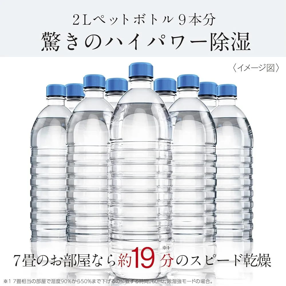 除湿性能 18L/日大容量ならではのハイパワー(60Hz時) 7畳のお部屋を約19分※ですばやく快適に ※部屋の広さ=7畳相当の部屋で湿度90%から50%まで下げるのに要する時間。除湿強モードの場合。