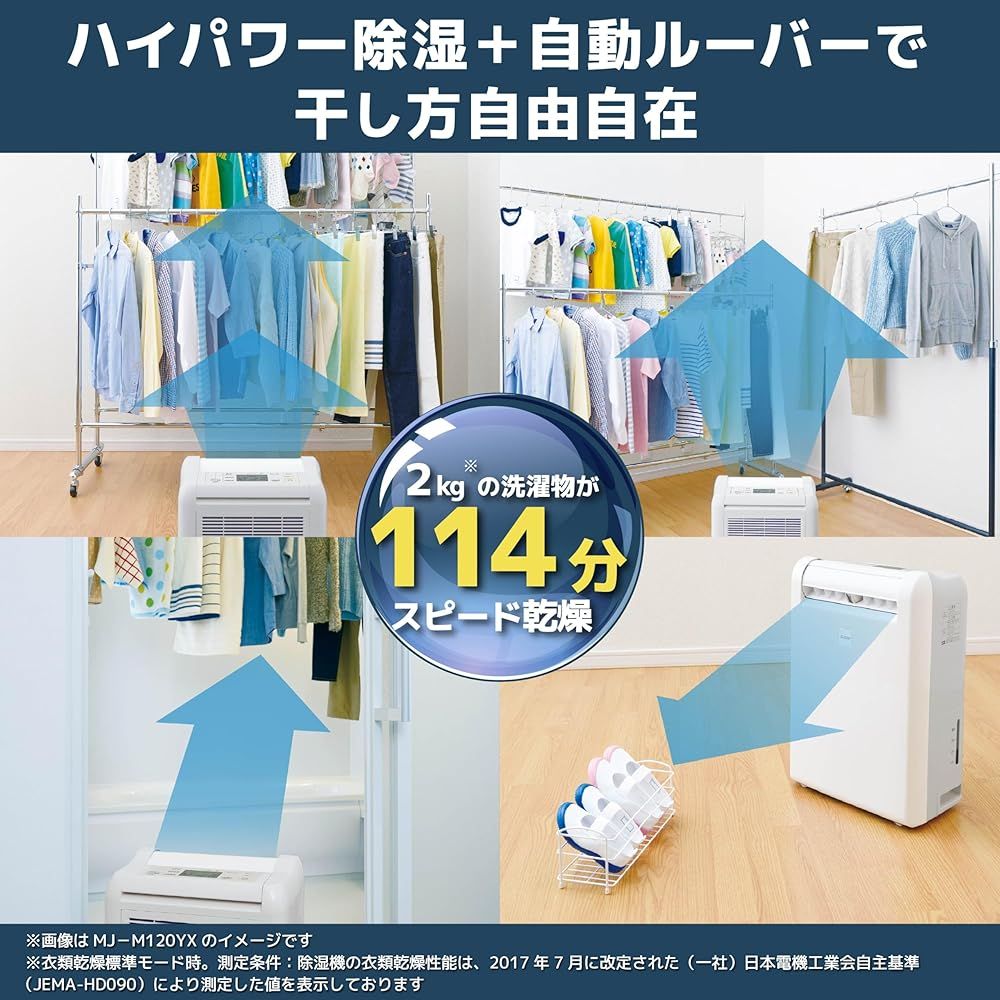 部屋干しもハイパワーで 衣類乾燥時にも、ハイパワーの除湿能力を発揮。大量の洗濯物もしっかりスピーディーに乾かします。