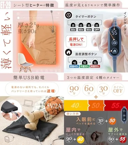 【規格】 ・サイズ:#W350xD2xH380mm ・重さ:約90g10g ・素材:ポリエステル ・推奨入力:5V/2A(USB給電) ・温度設定:弱(約40)/中(約50)/強(約55) ・タイマー設定:30分/60分/90分/OFF ・消費電力:最大10W ・付属コード:USB延長コード 約1.2m ・生産国:Made in China