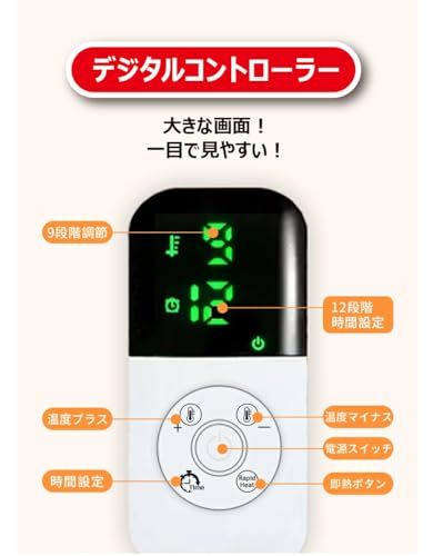 【温度調節とタイマー機能搭載】 この電熱シートは、30から50の範囲で9段階の温度調節が可能で状況に応じて自由に温度を切り替えることができます。 タイマー機能も備えており、1時間から12時間までの任意のタイミングで電源が自動的に切れる設定が可能です。