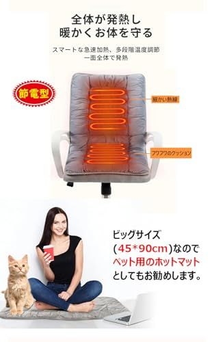 ホットマット 電気マット 電気座布団 椅子用 ヒーター 9段階温度調節 タイマー機能 カバー付き 洗える ペット カーペット PSE認証済み 45×90cm (Gray)t