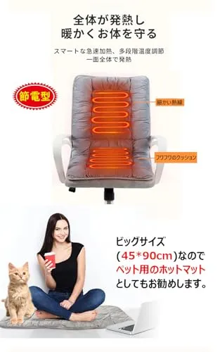 【冬のオフィス作業に寒さを心配しない】この加熱シートは、全体が発熱体となっており、4590cmの大きな面積を持ち、全方位から暖かさを提供します。冬の寒さから身を守るために最適です。このシートを背中やお尻、腰に敷くことで、ツボを刺激し、血液循環を促進し、効果的に保温します