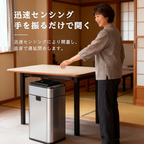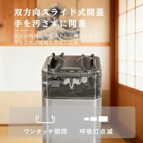 【ハンズフリー自動開閉で衛生快適】赤外線センサー搭載で、手をかざすだけで蓋が素早く滑らかに自動開閉。手が汚れていても触らずに使え、衛生的かつ便利。手動モードも備え、使用シーンに応じて切り替え可。蓋の汚れや指紋も減り、キッチンやリビングなど清潔重視の空間に最適。家庭用として、衛生・快適・手間なし操作を求める方におすすめ。