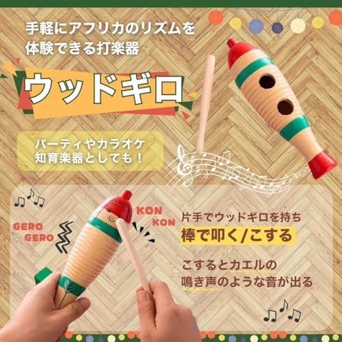 【カラフルなギロが音と色で子どもたちを魅了】 ウッドギロは、民族打楽器ならではの温かみと、視覚的な楽しさを兼ね備えています。棒でこするだけでユニークな音が鳴るため、小さなお子様でも直感的に扱えます。演奏会や発表会、バンドのアクセントとしても活躍。個性的な音色で楽曲に独自のスパイスを加えることができるため、音楽教育や演劇の効果音にもおすすめです。