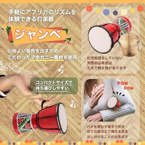 【アフリカ伝統の音色を手軽に体験!本格派ジャンベ】 マホガニー材と山羊皮で作られたジャンベは、アフリカの伝統的な打楽器を現代の暮らしに取り入れた一品です。直径約10cm・高さ20cmとコンパクトで、小学生から大人まで手軽に演奏可能。叩く位置や力加減で音色が変化するため、表現力の幅も広がります。カラフルで美しいドットペイントのデザインが魅力です。