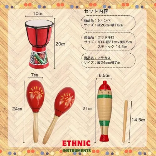 【セット内容】ジャンベ1、ウッドギロ1、マラカス2本