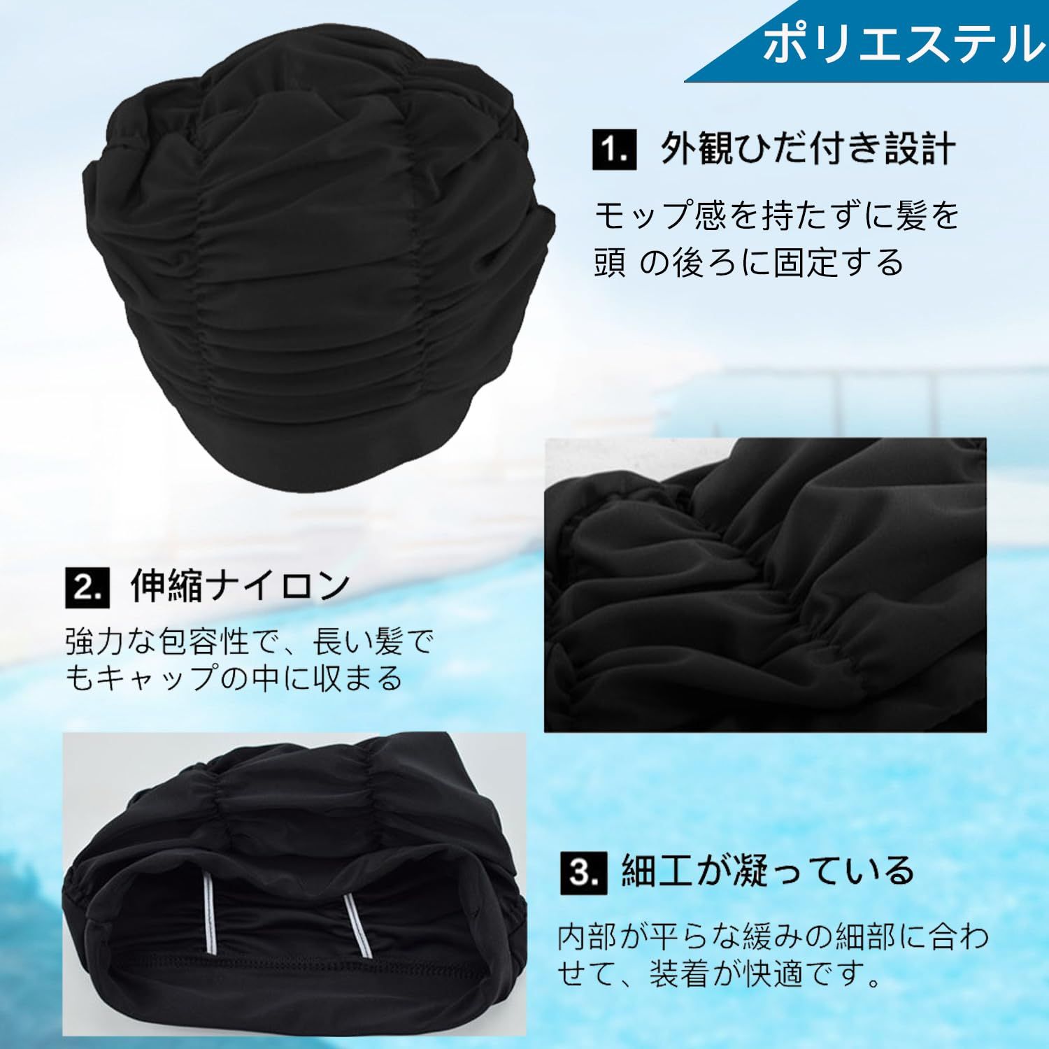 新品 サムコス スイムキャップ レディース 容量大きめ 水泳帽 水泳スイムキャップ 締め付け緩め ロングヘアーに対応 水 泳帽子 (黒)